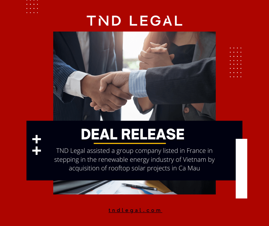 TND Legal is honored to have thoroughly assisted the investor who used its affiliate in a Singapore investor in acquiring all rooftop solar projects with total capacity of around 1 MWP in Ca Mau, which is the first step for the investor to step in the renewable energy industry of Vietnam.